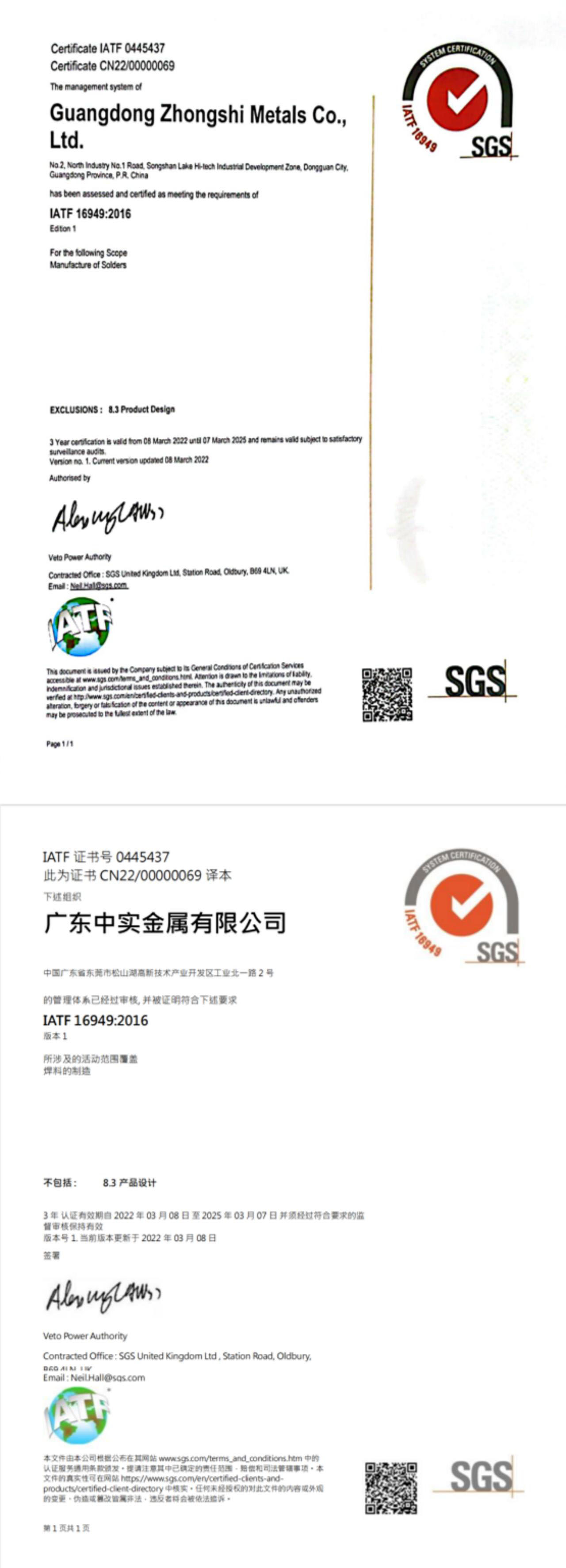 作为深耕高端焊料20多年的行业头部企业,五大联赛(中国)公司一直遵循严格的管理体系与方法进行产品研发和生产,公司先后通过了ISO9001质量管理体系认证、ISO14001环境管理体系认证、QC080000危害物质过程管理体系认证等。