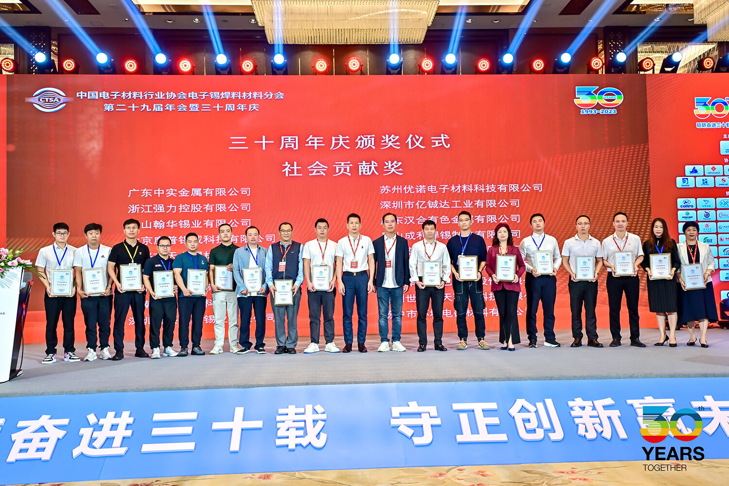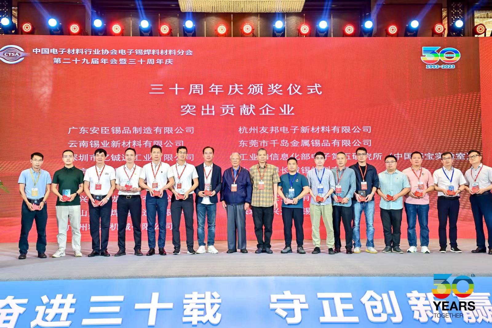 2023年10月19日,中国电子材料行业协会电子锡焊料材料分会第二十九届年会暨三十周年庆在广东·珠海举行。本届年会以 “砥砺奋进三十载,守正创新赢未来”为主题,旨在总结经验,表彰先进,研判形势,提振信心,推动行业企业高质量发展。